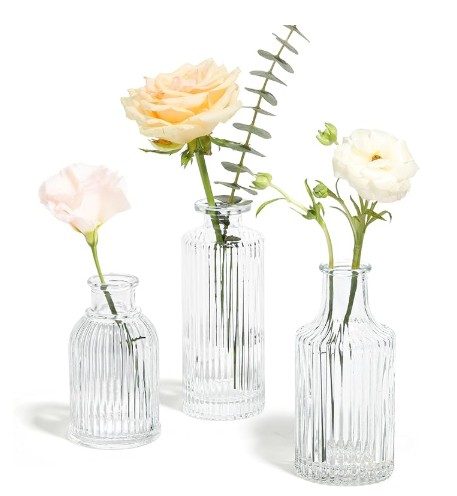 Our assortment of clear glass bud vases come in a variety of sizes and styles. **Florals not included.