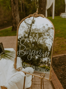 Our gold arched mirror adds a beautiful touch to any space. Commonly used for a welcome sign, and seating charts.