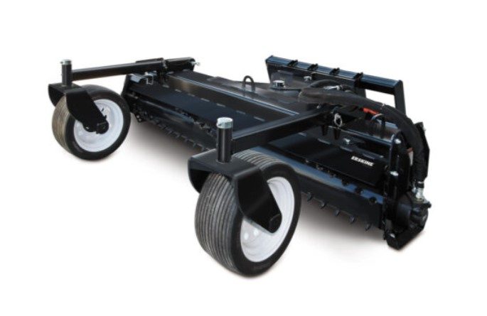 Mini skid Power Rake attachment- 48″ This versatile rake offers manual or hydraulic angle adjustment options and is known for delivering the high-level performance preparing seed beds, grading soil, and leveling gravel.
